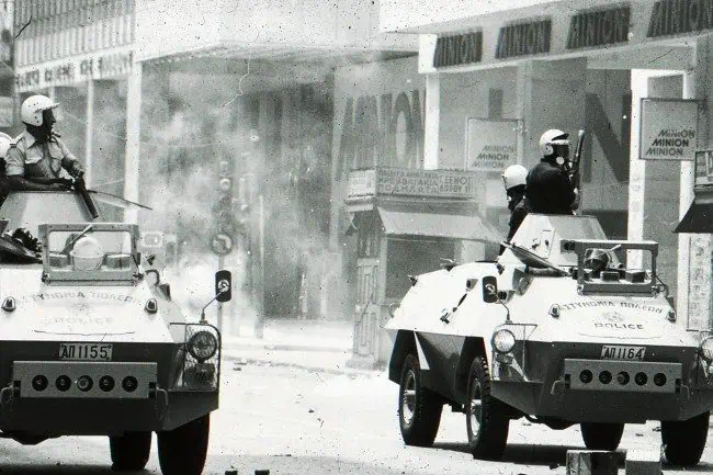 Την επομένη, η επίσης πρωτοφανής σε μαζικότητα συγκέντρωση των οικοδόμων στις 23 Ιούλη, θα πνιγεί στην αστυνομική βία. Οι αύρες, τα δακρυγόνα και οι… προβοκάτορες εγκαινιάζουν τη σκοτεινή σκηνή της μεταπολίτευσης: Στον Ριζοσπάστη αποδίδει το πνεύμα της επίσημης Αριστεράς της εποχής, ο Έμμετρος Ρίζος (υπογραφή Ο Παληός και τίτλος: Αύρες Δημοκρατίας): «… Προβοκάτσιες αντάμα με τις δακρυγόνες «αύρες»/ σε στενή συνεργασία με τις σκοτεινές δυνάμεις που τις κατευθύνει η ΣΙΑ/ μάχονται να ξαναφέρουν, περασμένες μέρες μαύρες!».