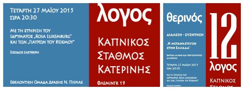 Η Εθελοντική Ομάδα Δράσης Ν. Πιερίας διάλεξε έντεκα από τους πιο διαδεδομένους μύθους σχετικά με τη μετανάστευση στην Ελλάδα και τους συζητά σε ανοιχτή εκδήλωση την Τετάρτη 27 Μαΐου 2015, ώρα 20:30, στην αυλή του Καπνικού Σταθμού Κατερίνης.