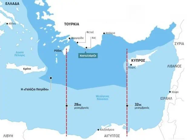 Απέναντι στην Ελλάδα, ο άμεσος στόχος είναι το γκριζάρισμα της ελληνικής κυριαρχίας από τον 25ο έως τον 32ο Μεσημβρινό. Ό,τι βρίσκεται εντός των δύο αυτών κάθετων ορίων, αμφισβητείται έμπρακτα, συνεχώς, με διάρκεια και μεθοδικότητα. Με σκοπό να μετατραπεί σε τουρκική κρατική επικράτεια, δια της απειλής ή της χρήσης όπλων και διά της κατάκτησης. Όποιος δεν το κατανοεί, απλώς ζει σε άλλο κόσμο και θέλει να ξεγελιέται με διάφορα «ανέκδοτα».