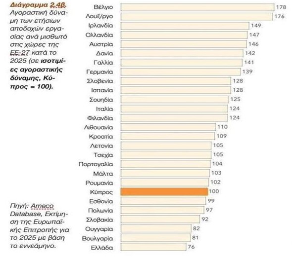 Στον πίνακα που δημοσιεύουμε (είναι αναπαραγωγή από το διαδίκτυο) φαίνεται ότι σε ισοτιμίες αγοραστικής δύναμης με την Κύπρο στο 100 η Ελλάδα είναι στο 76 και η Βουλγαρία που μας προσπέρασε είναι στο 81. Κάτω από το 100 είναι μόνο 6 χώρες της Ε.Ε. με την Ελλάδα τελευταία.