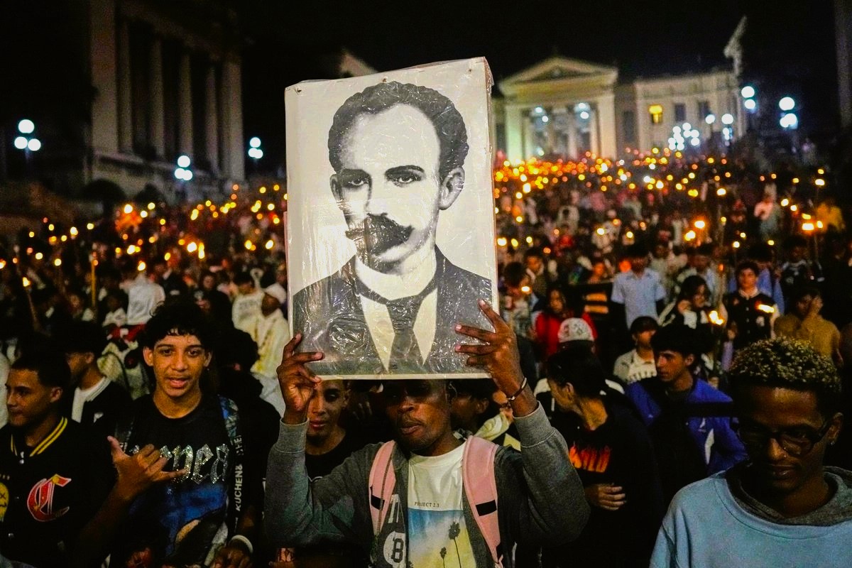 Στη φωτογραφία, η καθιερωμένη ετήσια λαμπαδηφορία στην Αβάνα προς τιμήν του ήρωα της ανεξαρτησίας Χοσέ Μαρτί φέτος μετατράπηκε σε μαζική και ζωηρή διαδήλωση κατά των ΗΠΑ.