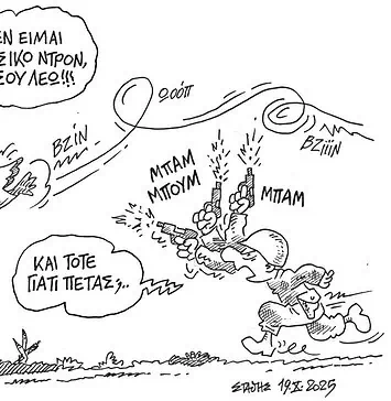 Σκίτσο του Στάθη Σταυρόπουλου από τη στήλη «Στην αυλή των θαυμάτων» του Δρόμου Δημοσιεύθηκε στις 15 Νοεμβρίου 2025.
