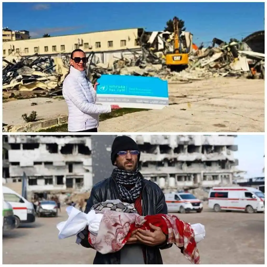 Στην κάτω φωτογραφία, ένα στιγμιότυπο της καθημερινότητας στη Γάζα: το σώμα της Σάθα Αμπού Ταράντ, ηλικίας 3 μηνών, μεταφέρεται από τον θείο της στο ημικατεστραμμένο νοσοκομείο αλ-Σίφα στην πόλη της Γάζας. Πέθανε από το κρύο. Δεν προσμετράται στα θύματα της γενοκτονίας, αφού πέθανε «ειρηνικά»… Με τέτοιες μεθόδους η συνεργασία κατοχικού παρακράτους και ΗΠΑ, υποβοηθούμενη από τη συνενοχή του αραβομουσουλμανικού κόσμου και της λεγόμενης διεθνούς κοινότητας, επιχειρεί να εξαφανίσει το αγκάθι που λέγεται Παλαιστίνη.