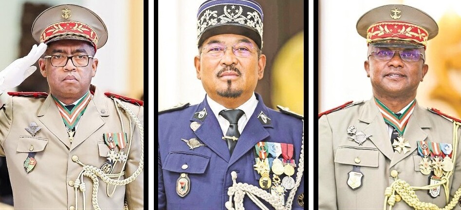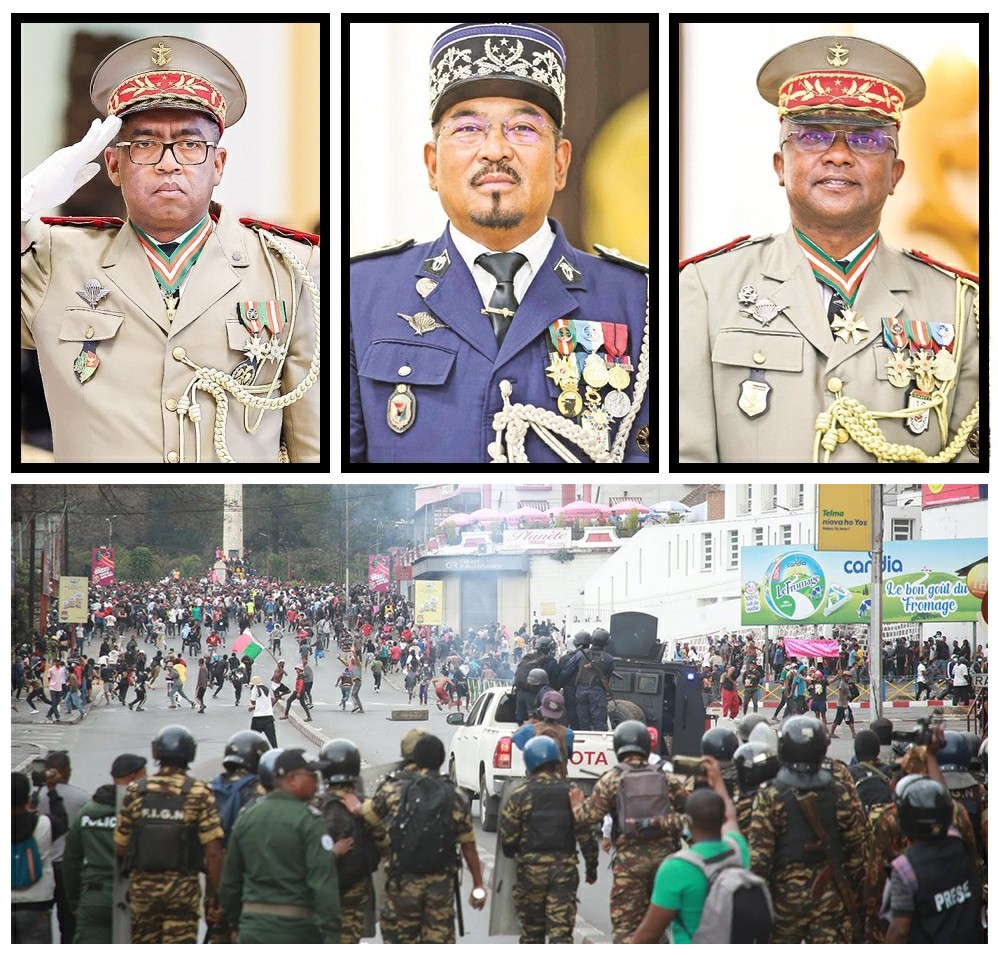 Αλλά την Τετάρτη διόρισε νέο πρωθυπουργό, καθώς και νέους υπουργούς Δημόσιας Τάξης και Άμυνας. Θαυμάστε τους, από αριστερά προς τα δεξιά: Στρατηγός Ρ. Ζαφισάμπο, πρωθυπουργός. Αρχηγός Χωροφυλακής Ρ. Αντριαμιτόβι, υπουργός Δημόσιας Τάξης. Μέραρχος Ντ. Ρακοτοαριβέλο, υπουργός Άμυνας.