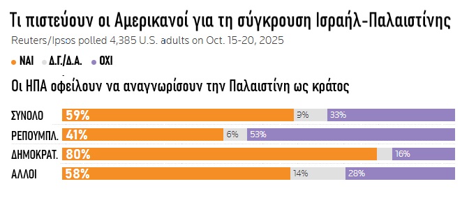 Η πλειονότητα των Αμερικανών πιστεύει ότι οι ΗΠΑ θα πρέπει να αναγνωρίσουν το Παλαιστινιακό κράτος, σύμφωνα με δημοσκόπηση των Reuters/Ipsos. Η έρευνα έδειξε ότι το 59% των ερωτηθέντων υποστηρίζει την αναγνώριση Παλαιστινιακού κράτους από τις ΗΠΑ (80% των Δημοκρατικών και 41% των Ρεπουμπλικανών), ενώ 33% δήλωσαν αντίθετοι. Το υπόλοιπο 8% ήταν αναποφάσιστοι ή δεν απάντησαν. Τα ποσοστά αυτά είναι ακόμη μεγαλύτερα μεταξύ των νέων, ανεξαρτήτως κόμματος.