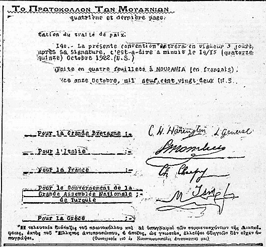 «καθ‘ην στιγμην περατουται ἡ Στρατιωτικη καὶ ἡ ἀστικὴ ἐκκένωσις τῆς Θράκης ἠτις διεξήχθη μετὰ τόσης τάξεως καὶ πειθαρχίας ἐκ μέρους ἡμετέρας Στρατιωτικῆς Διοικήσως Κυβέρνησις ἔχει καθηκον νὰ παρακαλέση,Υμας νὰ ἐκφρασητε εἰς τῆς Ἄγγλικην Κυβερνησιν τὰς εὐχαριστίας αὐτης διὰ τὴν εὐκολίαν την συμπαθειαν καὶ τὴν προσταιαν ᾖς ἐτυχον ἠμετερος στρατος καὶ πληθυσμοι ἐκ μερους Ἄγγλικων Ἄρχων ἐν γενει καὶ ἰδιαιτερως Ἄρχιστρατηγον Χαριγκτων. »