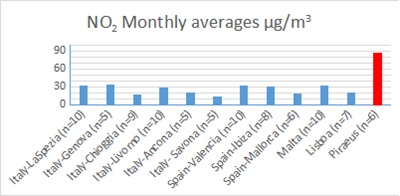 Οι Πολίτες στον Πειραιά έχουν ευαισθητοποιηθεί και έχουν αναδείξει μεθοδολογίες που μπορούν να χρησιμοποιηθούν αποδίδοντας αποτελέσματα συγκρίσιμα με αυτά του Υπ. Περιβάλλοντος. Έτσι μελέτες μας έχουν δείξει ότι στο κέντρο του Πειραιά (Αγ. Τριάδα) τα επίπεδα του NO2 είναι πολύ υψηλότερα από το όριο της Ε.Ε. και του ΠΟΥ. Μάλιστα σε 14 πόλεις / λιμάνια ο Πειραιάς είναι ο «πρωταθλητής» όπως αναδείχθηκε σε μια μελέτη του NABU, που συμμετείχαν οι πολίτες του Πειραιά. Τα αποτελέσματα αυτά παρουσιάζονται στο παρακάτω σχήμα όπου τα αποτελέσματα του Πειραιά συγκρίνονται με άλλες 13 μεγάλες πόλεις – λιμάνια της Μεσογείου. Τα αποτελέσματα ανέδειξαν ότι οι μετρήσεις στον Πειραιά ήταν οι υψηλότερες όλων των πόλεων που έγιναν μετρήσεις με μεγάλη διαφορά (90 μικρογραμμάρια/κυβικό μέτρο αέρα) δηλαδή το διπλάσιο από το όριο της Ε.Ε. και οκτώ φορές υψηλότερο από εκείνο (10 μικρογραμμάρια/κυβικό μέτρο αέρα) που έχει θέσει ο Παγκόσμιος Οργανισμός Υγείας (ΠΟΥ). Τα αποτελέσματα παρουσιάζονται στο παρακάτω σχήμα.