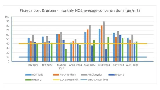Οι Πολίτες του Πειραιά έχουν προχωρήσει σε μετρήσεις που καλύπτουν όλο το 2024 και αναδεικνύουν, όπως φαίνεται και στο παρακάτω σχήμα (Σχήμα2) ότι σε όλα τα σημεία μέτρησης (ακόμα και μέσα στον αστικό ιστό) ο μηνιαίος και ετήσιος μέσος όρος υπερβαίνει τα όρια της Ευρωπαϊκής Οδηγίας 2008/50/ΕΚ.