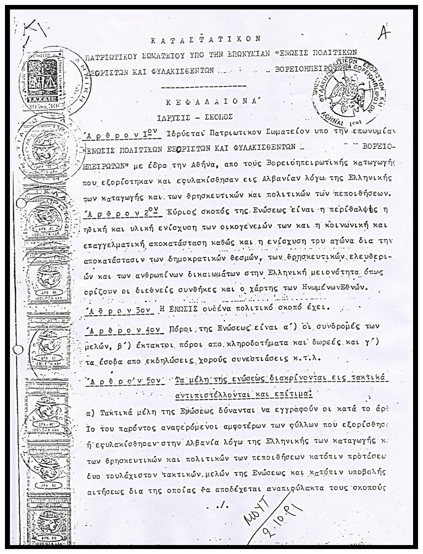 Στην Αθήνα χτυπούσαμε πολλές πόρτες… Δεν συνειδητοποιούσαμε την πραγματικότητα. Δεν θέλαμε να πιστέψουμε ότι μας αγνοούσαν. Πιστεύαμε το αντίθετο, ότι δηλαδή εμείς φταίγαμε που ο πολιτικός κόσμος της Ελλάδας και η Ελληνική Κυβέρνηση δεν είχε συγκεκριμένο πρόγραμμα για την επίλυση των πολλών ζητημάτων μας. Παντού, όπου κάναμε γνωστά τα προβλήματά μας, οι συνομιλητές μάς κατανοούσαν, δείχνανε συμπόνια, κάποιος βοηθούσε από την τσέπη του, κάποιος δάκρυζε. Αλλά την επόμενη μέρα και την επόμενη και την επόμενη ήμασταν ξανά και ξανά στο μηδέν. Σέρναμε βαρύ φορτίο στις πλάτες μας, ήμασταν σκοτωμένοι ψυχικά και σακατεμένοι βιολογικά, αλλά κάθε μέρα που ξημέρωνε μας έδινε καινούργιες δυνάμεις, φρεσκάδα, ελπίδα και δύναμη για καινούργιο ξεκίνημα. Πιστεύαμε ακράδαντα ότι τελικά θα μας καταλάβαιναν και θα έκαναν απέναντί μας το καθήκον τους, θα μας έδιναν αυτό που μας ανήκε, τα δικαιώματά μας. Παντού όπου απευθυνόμασταν, μας έδιναν μια συμβουλή: «Πρέπει να οργανωθείτε, να κάνετε ένα σύλλογο, να εκπροσωπείστε από έναν πρόεδρο, να είστε νόμιμοι, με καταστατικό κ.λπ., έτσι θα πάρουμε υπόψη τα αιτήματα και θα βρείτε υποστήριξη». Ιδρύσαμε λοιπόν το σωματείο μας, με την επωνυμία «Ένωση Πρώην Πολιτικών Φυλακισθέντων και Εξορισθέντων Βορειοηπειρωτών» με έδρα την Αθήνα, που αναγνωρίστηκε με την υπ’ αριθ. 1801/1991 απόφαση τού Πρωτοδικείου Αθηνών. Εκλέχτηκε και το προεδρείο. Ήμασταν αγαπημένοι, ήμασταν όλοι ίσοι αναμεταξύ μας, βασίλευαν ο αλληλοσεβασμός και η απόλυτη εμπιστοσύνη. Είμαστε ο ένας για τον άλλο. Τότε, ήταν το μόνο σωματείο των Βορειοηπειρωτών πού λειτούργησε νόμιμα και πατριωτικά στη Μητέρα Πατρίδα…