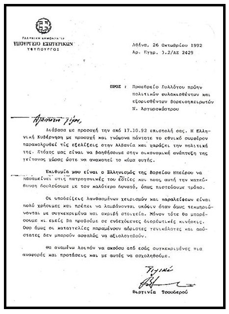 Η τότε υφυπουργός Εξωτερικών, Βιργινία Τσουδερού, μάς παρέπεμψε σε αρμοδίους υπαλλήλους. Στα μέσα Αυγούστου του 1991 μάς ανακοίνωσαν πως πλέον θα απευθυνόμαστε αποκλειστικά στο Εθνικό Ίδρυμα Αποδοχής Αποκατάστασης Παλιννοστούντων [1] Ομογενών Ελλήνων στην Αθήνα. Ο κύριος Κόκκινος, επί των οικονομικών του Ιδρύματος, τόνισε στη συνάντησή μας μεταξύ άλλων: «Διωχτήκατε και φυλακιστήκατε ως Αλβανοί. Η Ελλάδα δεν σάς χρωστά τίποτε. Χτυπάτε λάθος πόρτες». Χωρίς να τηρήσουμε τύπους και ψεύτικους κανόνες, τού επισημάναμε ότι καταδικαστήκαμε ως Αλβανοί πολίτες, όμως για 50 και πλέον χρόνια που βασανιστήκαμε, δεν απεμπολήσαμε την ελληνική μας καταγωγή. Δεν είμαστε ζητιάνοι, του είπαμε, η Ελλάδα χρωστά πολλά στη Βόρεια Ήπειρο, και θα αναγκαστούμε να απευθυνθούμε σε διεθνείς φορείς. Έτσι φουρτουνιασμένοι φωνάξαμε στους συντρόφους: «Πάμε να φύγουμε». Ως έμπειρος διπλωμάτης, το «μαλάκωσε» και μάς ζήτησε τα αιτήματά μας και μια πλήρη εικόνα για τις περιοχές που ζουν Έλληνες στην Αλβανία. Για πολλοστή φορά διατυπώσαμε τα αιτήματά μας…