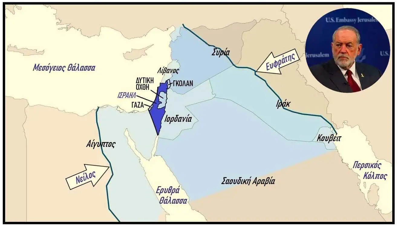 Σύμφωνα με τους σιωνιστές, αλλά πλέον και τον πρέσβη των ΗΠΑ στο κατοχικό παρακράτος, το «Μεγάλο Ισραήλ» περιλαμβάνει –βάσει… βιβλικού δικαιώματος– όλη την περιοχή μεταξύ του ποταμού Νείλου και του ποταμού Ευφράτη. Δηλαδή: