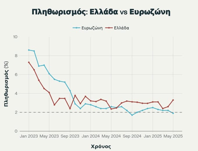 Σύμφωνα με τα στοιχεία της Τραπέζης της Ελλάδος (Έκθεση για τη Νομισματική Πολιτική 2024-2025, Ιούνιος 2025), ο γενικός πληθωρισμός παρουσιάζει στοιχεία επιμονής, με αποτέλεσμα να καθυστερεί η αποκλιμάκωσή του σε σχέση με τον πληθωρισμό για το σύνολο της ζώνης του ευρώ. Ο γενικός πληθωρισμός παρέμεινε κατά μέσο όρο κοντά στο 3% τους πέντε πρώτους μήνες του 2025, ωστόσο τον Μάιο αυξήθηκε στο 3,3% (έναντι 1,9% στην Ευρωζώνη), κυρίως λόγω της αύξησης των τιμών στα είδη διατροφής και στα μη ενεργειακά βιομηχανικά αγαθά. Η επιμονή του πληθωρισμού των υπηρεσιών, λόγω μισθολογικών αυξήσεων, έμμεσων φόρων (στην εστίαση και στη διαμονή) και υψηλής, εξωτερικής κυρίως, ζήτησης (τουρισμός), εμποδίζει την ταχεία αποκλιμάκωσή του.