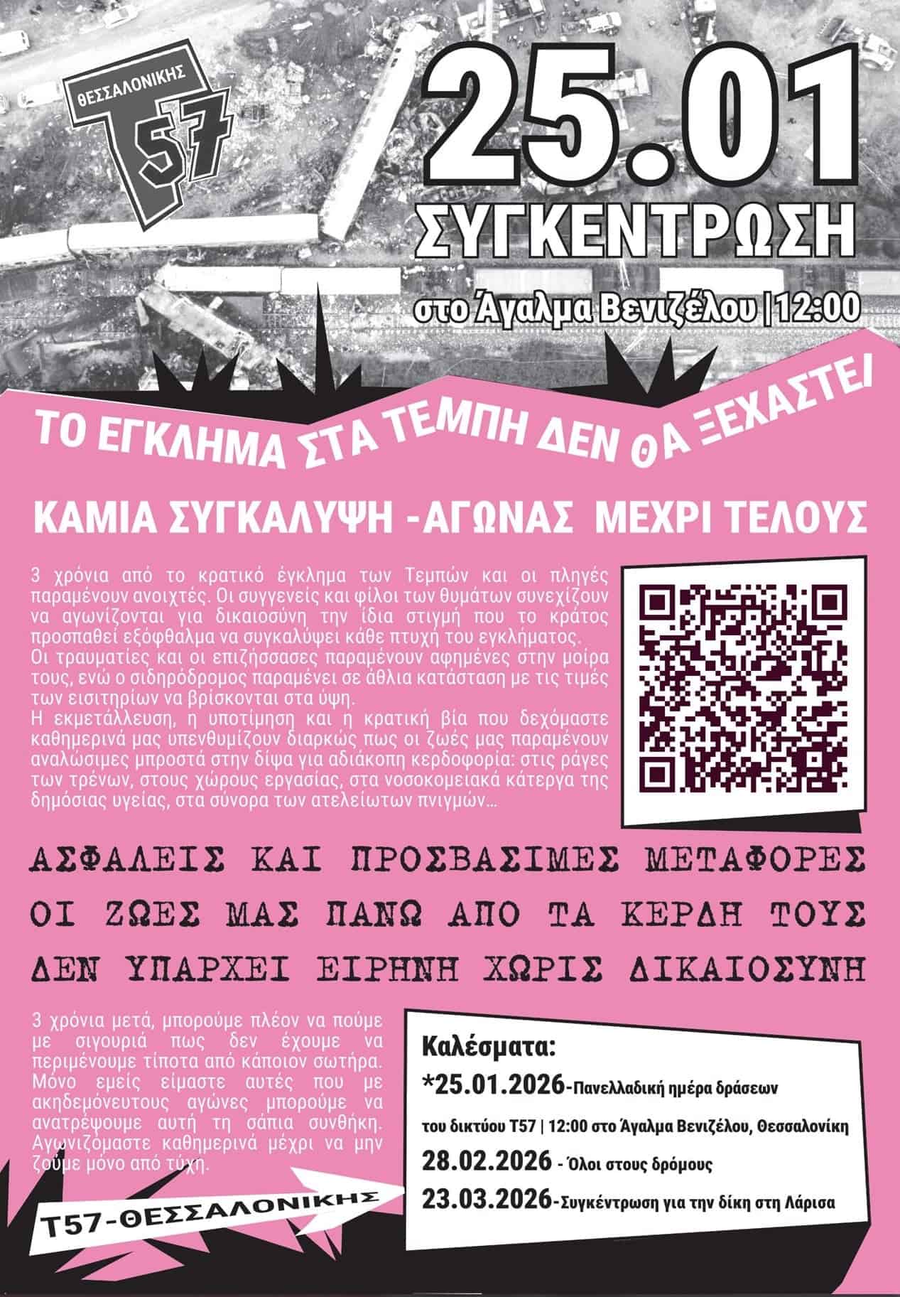 Το Δίκτυο Τ57 οργανώνει πανελλαδική ημέρα δράσης για τα Τέμπη, την ερχόμενη Κυριακή 25/1 σε μια σειρά πόλεις. Η ημέρα δράσης πραγματοποιείται έναν σχεδόν μήνα πριν την τρίτη επέτειο του εγκλήματος, και έχει σαν στόχο να κρατήσει ζωντανή την υπόθεση της δικαίωσης στον δημόσιο χώρο. Παρακάτω κάποια από τα καλέσματα: