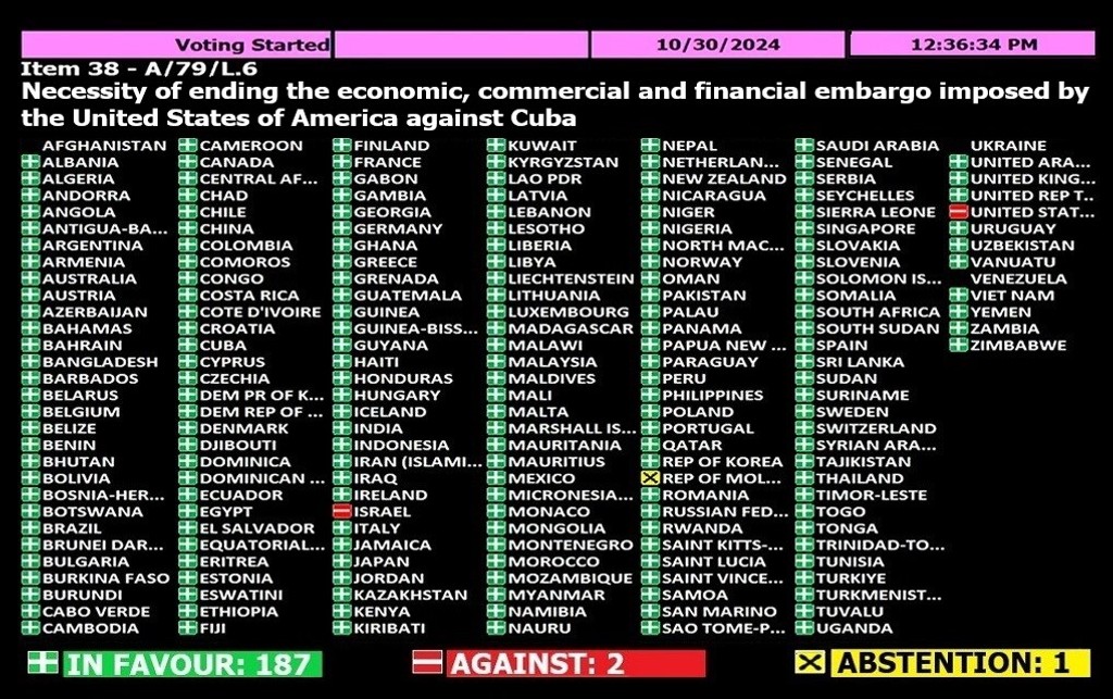 Η Γενική Συνέλευση συζήτησε και φέτος το ζήτημα του παράνομου και εξοντωτικού αποκλεισμού της Κούβας από τις ΗΠΑ. Και για μια ακόμη χρονιά ζήτησε την κατάργησή του, με κυριολεκτικά συντριπτική πλειοψηφία. Ποια είναι η μοναδική άλλη χώρα στον κόσμο που υποστηρίζει τον αποκλεισμό; Φυσικά το Ισραήλ…
