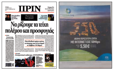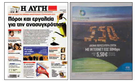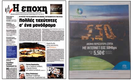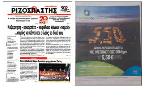 Εμείς δεν έχουμε τέτοιες διαφημίσεις. Για την Αυγή ή την Εποχή δεν εκπλαγήκαμε ιδιαίτερα όταν είδαμε την διαφήμιση της Cosmote στο οπισθόφυλλο τους. Για το Πριν, που έκανε το ίδιο, και τον Ριζοσπάστη που την είχε στην σελίδα 5 η αλήθεια είναι ότι μας παραξένεψε, αν και δεν είναι η πρώτη φορά. Σε αντίθεση με τις κυβερνητικές και τις άλλες αριστερές εφημερίδες ο Δρόμος δεν εξαρτά την έκδοση του από τις «διαφημίσεις» πολυεθνικών, τραπεζών ή άλλων επιχειρηματικών ομίλων. Την εξαρτά μόνο από τους αναγνώστες του και τους φίλους του .
