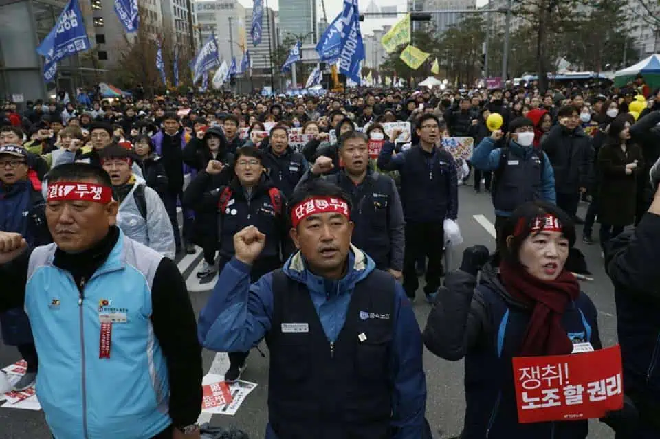 Αποτέλεσμα των αλλεπάλληλων διώξεων και απαγορεύσεων ήταν η εξασθένιση των νοτιοκορεατικών συνδικάτων, που με την προχθεσινή απεργία δείχνουν τα πρώτα σημάδια μιας χειροπιαστής αναγέννησης. Οι μεταλλεργάτες αποτέλεσαν την πιο συμπαγή δύναμη στη γενική απεργία που κήρυξε η κορεατική συνδικαλιστική ομοσπονδία KCTU, στην οποία συμμετείχαν πλήρως λίγοι ακόμη κλάδοι. Σε άλλους εργασιακούς χώρους οι εργαζόμενοι συμμετείχαν με στάσεις εργασίας, ενώ στις επιχειρήσεις όπου ασκείται η μεγαλύτερη πίεση και είναι μεγάλος ο φόβος της απόλυσης περιορίστηκαν στην πραγματοποίηση σύντομων συγκεντρώσεων ή γενικών συνελεύσεων. Σε κάθε περίπτωση, εκατοντάδες χιλιάδες διαδήλωσαν μπροστά στη βουλή στην πρωτεύουσα, και σε άλλα κυβερνητικά κτίρια στις υπόλοιπες μεγάλες νοτιοκορεατικές πόλεις.