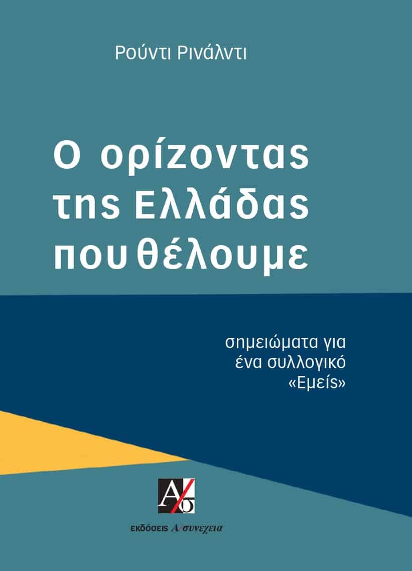 Τις επόμενες μέρες κυκλοφορεί, από τις εκδόσεις Α/συνεχεια, το νέο βιβλίο του Ρούντι Ρινάλντι με τίτλο: «Ο ορίζοντας της Ελλάδας που θέλουμε». Δημοσιεύουμε τον πρόλογο του βιβλίου, σαν μια αναγκαία κατατοπιστική εισαγωγή για το περιεχόμενό του: