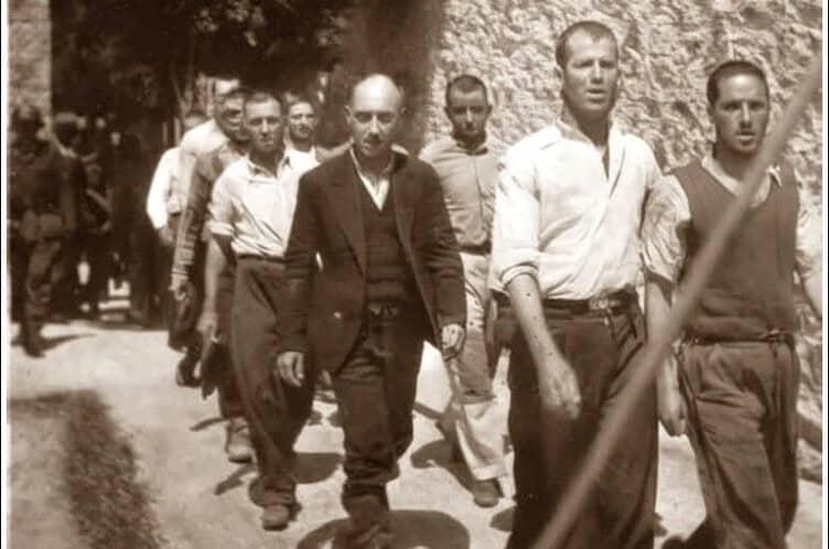 Πραγματικά οι Γερμανοί γυρίζανε τις παρέες… μαζί τους κι ο παπάς που ’παιζε την τυφλόμυγα. Σε λίγο ο Πέτρος κι ο νεαρός είδαν να σηκώνουνε τον εργατικό τον Μακεδόνα που ’χε πιαστεί με τον παπά, και όλη την παρέα του. Κι εκεί ενώ φαινότανε να τους ρωτούνε οι πεταλάδες ήσυχα, κάτι άλλοι μαυροντυμένοι Γερμανοί, που στεκόντουσαν πιο πίσω σαν αδιάφοροι, έριξαν. Αντιλάλησαν οι πλαγιές από τις ριπές. Μετά οι Γερμανοί κάνανε μεταβολή και πήγανε προς τ’ αυτοκίνητά τους κάτω… ο παπάς έτρεξε πίσω τους, αλλά ένας πεταλάς τον άρχισε στις κλωτσιές. Απόμεινε εκεί στα μισά του δρόμου φωνάζοντας: