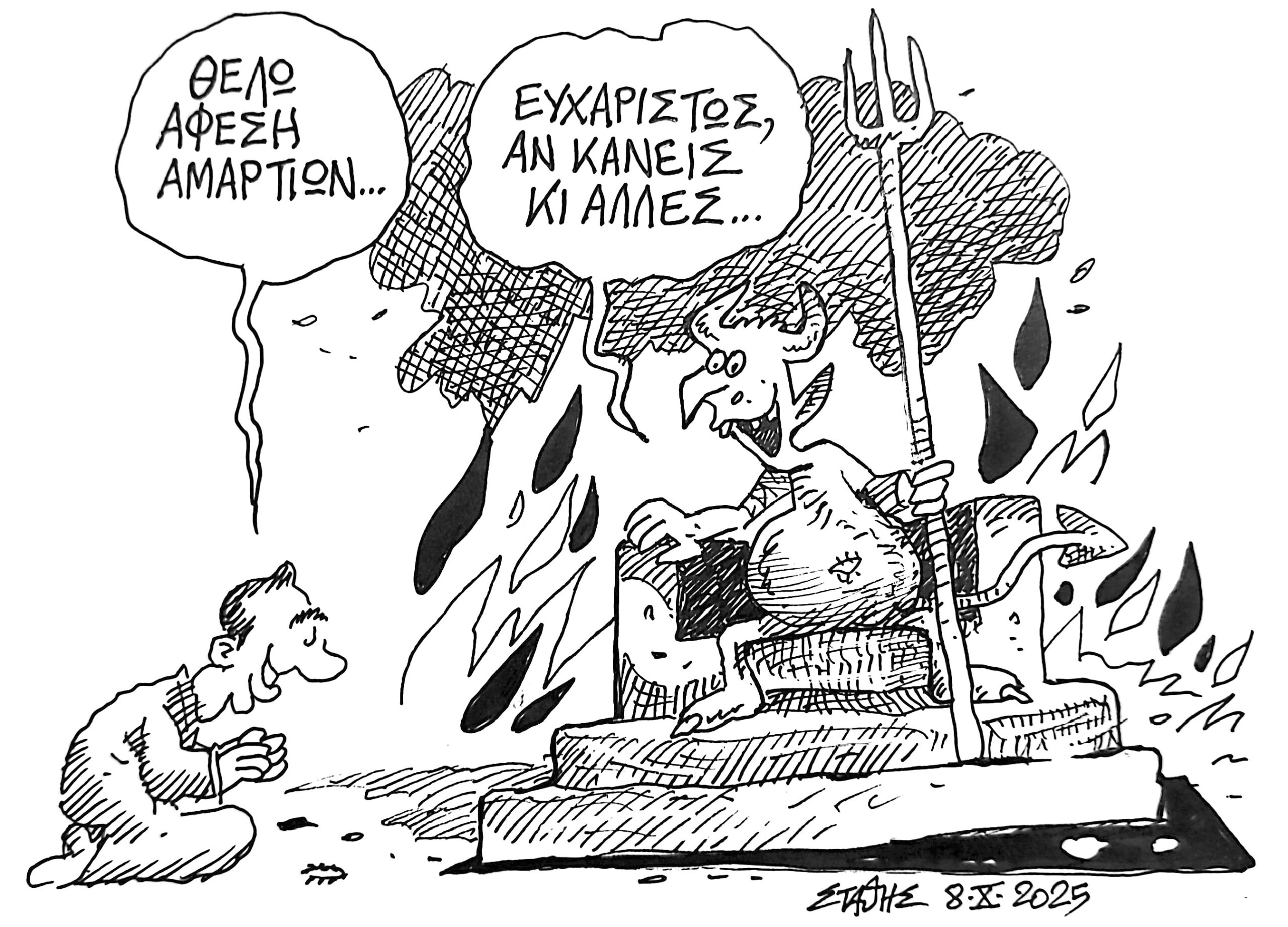 Σκίτσο του Στάθη Σταυρόπουλου από τη στήλη «Στην αυλή των θαυμάτων» του Δρόμου Δημοσιεύθηκε στις 11 Οκτωβρίου 2025.