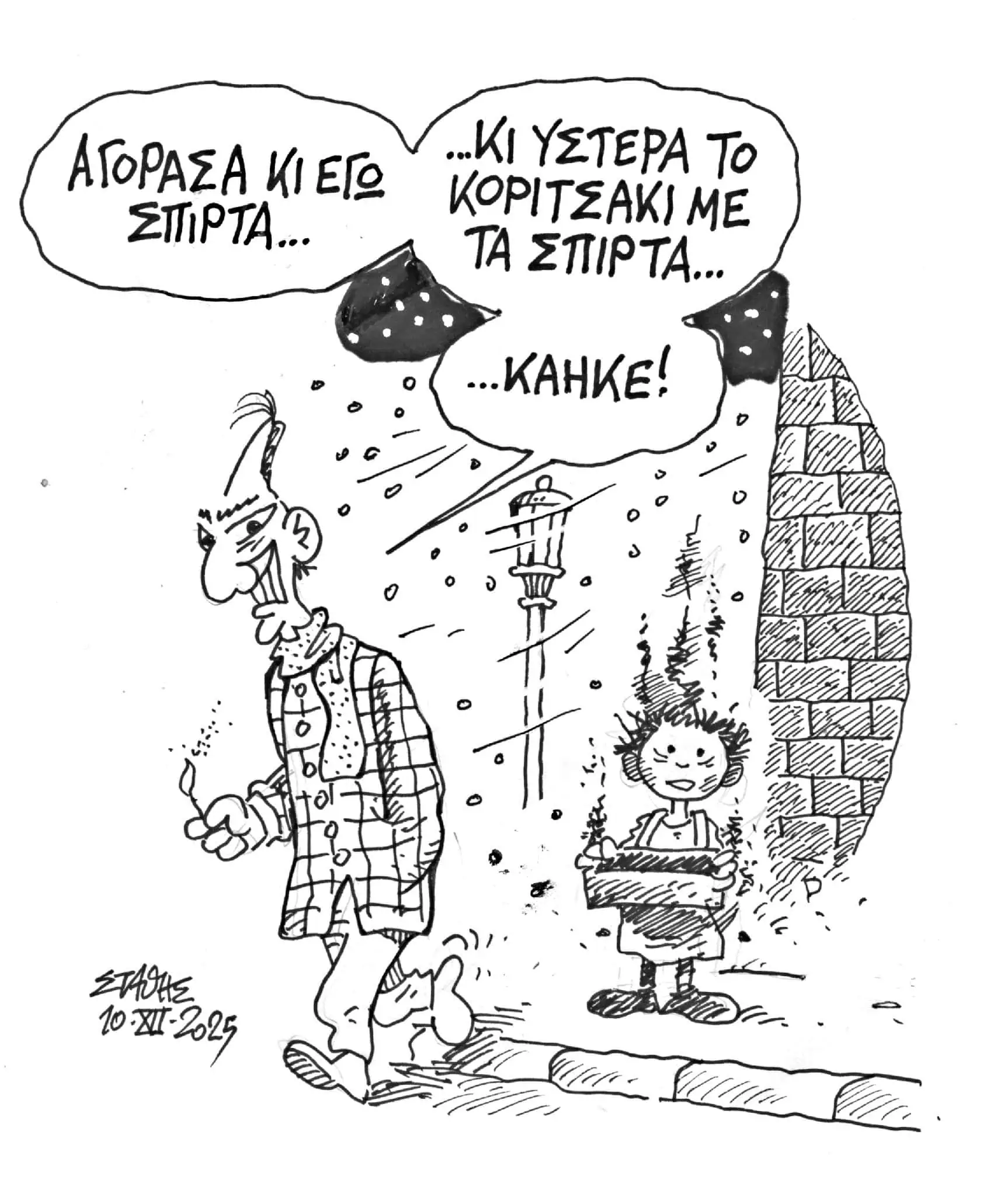 Σκίτσο του Στάθη Σταυρόπουλου από τη στήλη «Στην αυλή των θαυμάτων» του Δρόμου Δημοσιεύθηκε στις 20 Δεκεμβρίου 2025.