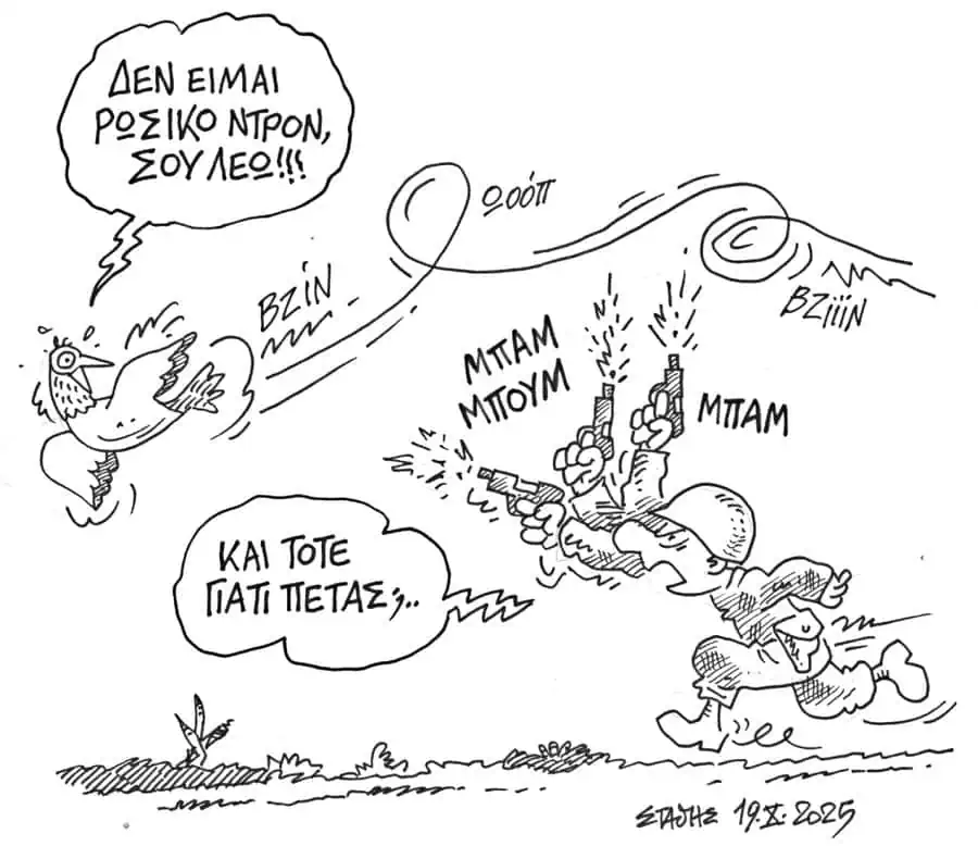 Σκίτσο του Στάθη Σταυρόπουλου από τη στήλη «Στην αυλή των θαυμάτων» του Δρόμου Δημοσιεύθηκε στις 22 Νοεμβρίου 2025.