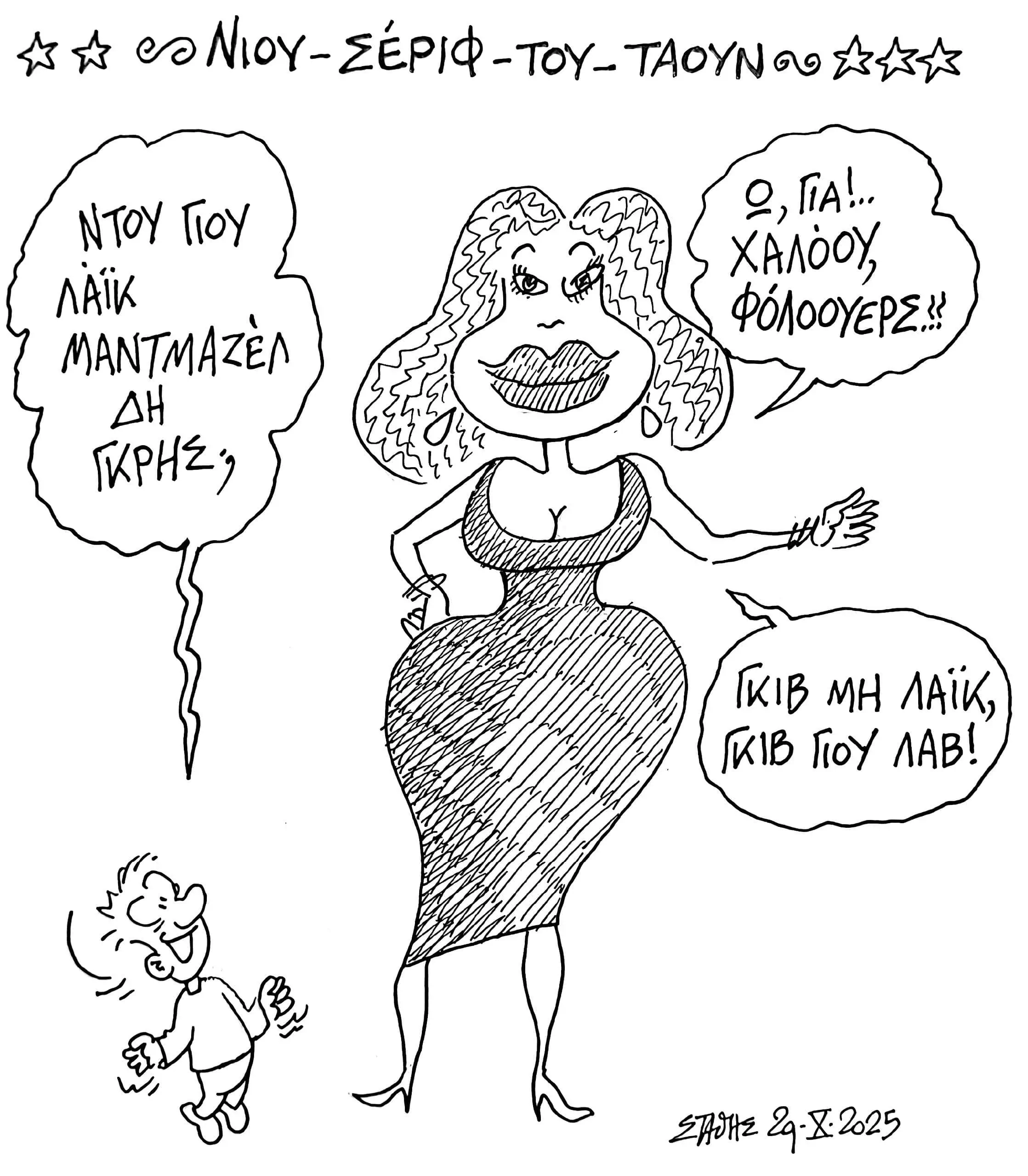 Σκίτσο του Στάθη Σταυρόπουλου από τη στήλη «Στην αυλή των θαυμάτων» του Δρόμου Δημοσιεύθηκε την 1η Νοεμβρίου 2025.