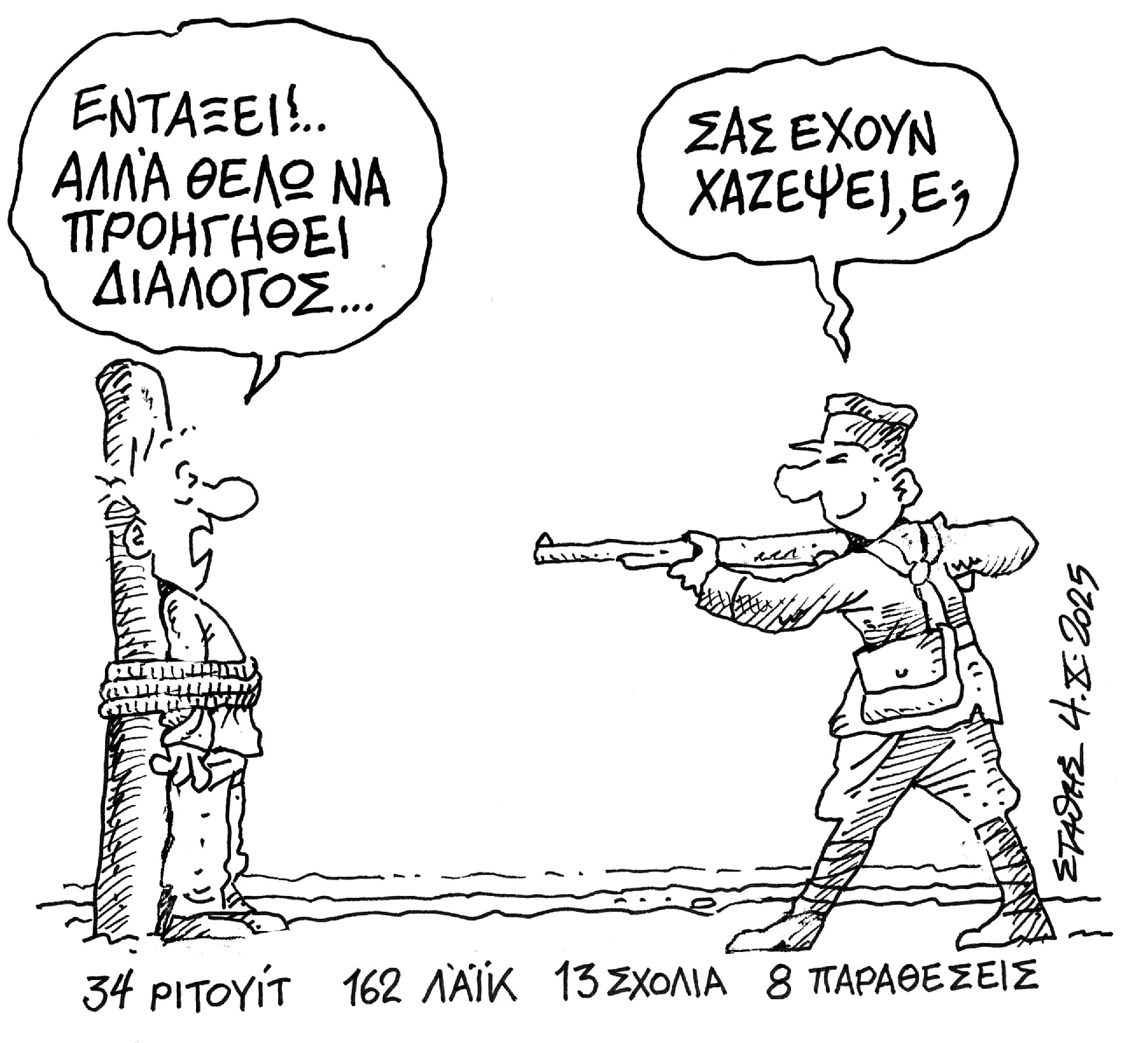 Σκίτσο του Στάθη Σταυρόπουλου από τη στήλη «Στην αυλή των θαυμάτων» του Δρόμου Δημοσιεύθηκε στις 8 Νοεμβρίου 2025.
